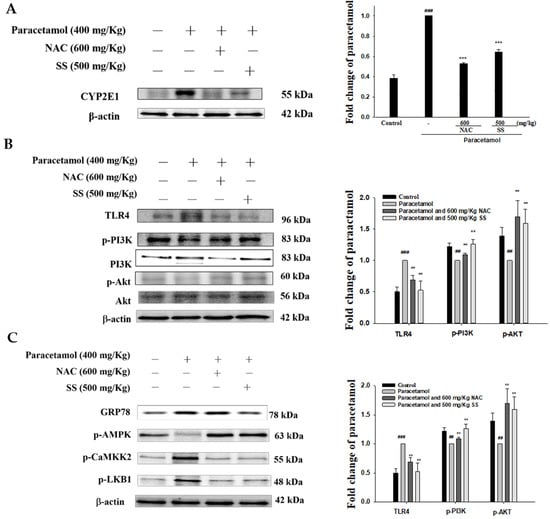 SS inhibited CYP2E1 (A), TLR4, PI3K, AKT (B), GRP78, p-AMPK, p-LKB1, and p-CaMKKβ (C) protein expression in paracetamol-exposed mice. Total protein was extracted from liver tissues. The protein expression levels were determined by Western blotting. The bands’ intensities were quantified and normalized to those for β-actin. The values are reported as the means ± S.E.M. of five mice per group. ## p < 0.01, ### p < 0.01 relative to the control group; ** p < 0.01 and *** p < 0.001 relative to the paracetamol group.