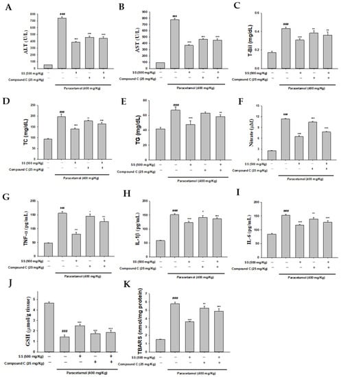SS and AMPK inhibitor (compound C) reduced AST (A), ALT (B), T-Bil (C), TC (D), TG (E), NO (F), TNF-α (G), IL-1β (H), IL-6 (I), GSH (J), and MDA (K). SS was orally administered to mice for 6 days, with the last dose 1 h before paracetamol administration. The values are reported as the means ± S.E.M (n = 6) of five mice per group. ### p < 0.01 relative to the control group; * p < 0.05, ** p < 0.01, and *** p < 0.001 relative to the paracetamol group.