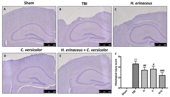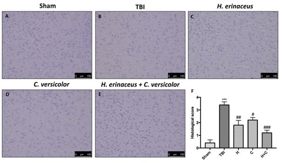 H. erinaceus (H), C. versicolor (C) and H. erinaceus + C. versicolor (H + C) reduce the severity of brain trauma. No alterations in brain tissues from Sham mice (A). In contrast, brain images after traumatic brain injury (TBI) show tissue disorganization and white matter alteration at 30 days post injury (B). Significant protection from TBI was evident in tissue collected from mice treated with H (C), C (D) and especially H + C (E). The figures are representative of at least three experiments performed on different experimental days. Each data is expressed as the mean ± standard error of the mean (SEM) of n = 5 male CD1 mice for each group. (F) *** p < 0.001 vs. Sham; ## p < 0.01 vs. TBI; # p < 0.05 vs. TBI; ### p < 0.001 vs. TBI.
