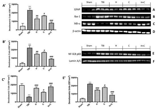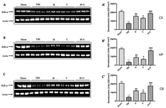 As for IkB-α, a significant decrease in the expression of this protein was observed in all brain areas examined in the TBI group, while treatment with H, C, and especially with H + C restored IkB-α levels (Figure 6A–C, see relative densitometry analysis Figure 6A’–C’).