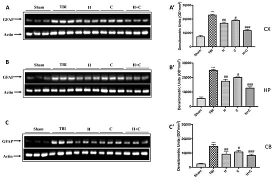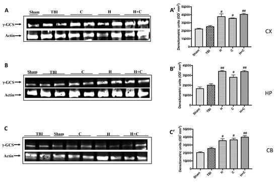 Also, with regard to γ-GCs, a significant increase in the expression of this protein was observed by treatments with H, C and H + C in all brain areas examined, compared to the Sham and TBI group (Figure 10A–C, see relative densitometry analysis Figure 10A’–C’).