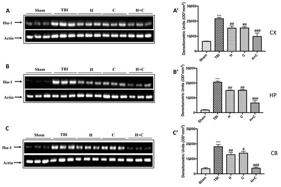Furthermore, the levels of GFAP, Iba-1 and IkB-α were measured by Western blot analysis in the cortex (Cx), in the hippocampus (Hp) and in the cerebellum (Cb). A significant increase of GFAP and Iba-1 was observed in the TBI group, while in animals treated with H and C and especially with H + C, a significant decrease was observed for GFAP and Iba-1 in all regions of the brain examined (Figure 4A,A’–C,C’ for GFAP and Figure 5A,A’–C,C’ for Iba-1).