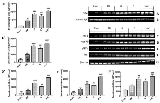 Our results showed that the proteins responsible for anti-oxidant defense such as Nrf2, HO-1, Hsp-70, γGCs and Trx already increased after 30 days from the TBI compared to the control group. The three treatments, especially the association between H and C, was able to further and significantly increase the expression of these proteins (Figure 7A,C–F, see relative densitometry analysis Figure 7A’,C’–F’).