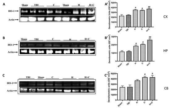 Effect of H. erinaceus or C. versicolor, or H. erinaceus + C. versicolor treatment on HO-1 protein after chronic TBI. Western blot analysis showed that the expression of HO-1 increased insignificantly in the TBI group in CX (A), HP (B) and CB (C) regions. H, C, and H + C treatment further significantly increased the expression of HO-1 (A–C). The data are expressed as the mean SEM from n = 5 mice/group. Densitometry analysis: (A’) # p < 0.05 vs. TBI; # p < 0.05 vs. TBI; ## p < 0.01 vs. TBI; (B’) # p < 0.05 vs. TBI; # p < 0.05 vs. TBI; ## p < 0.01 vs. TBI; (C’) # p < 0.05 vs. TBI; # p < 0.05 vs. TBI.