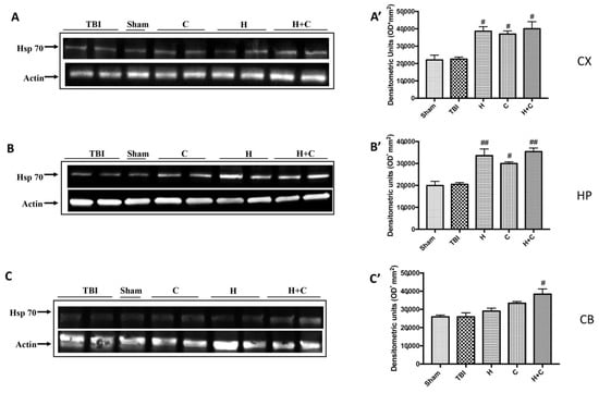 Effect of H. erinaceus or C. versicolor, or H. erinaceus + C. versicolor treatment on Hsp-70 protein after chronic TBI. Western blot analysis showed that the expression of Hsp-70 increased insignificantly in the TBI group in CX (A), HP (B) and CB (C) regions. H, C, and H + C treatment further significantly increased the expression of Hsp-70 in CX and HP regions (A,B). In CB area only H + C treatment significantly increased Hsp-70 expression (C). The data are expressed as the mean SEM from n = 5 mice/group. Densitometry analysis: (A’) # p < 0.05 vs. TBI; # p < 0.05 vs. TBI; # p < 0.05 vs. TBI; (B’) ## p < 0.01 vs. TBI; # p < 0.05 vs. TBI; ## p < 0.01 vs. TBI; (C’) # p < 0.05 vs. TBI.