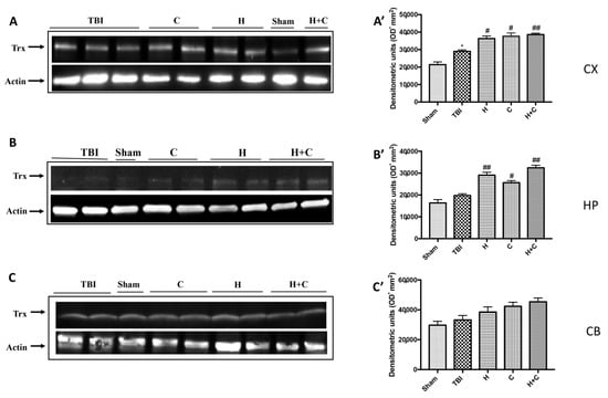 Finally, the expression of the Trx protein was significantly increased by treatments with H, C and H + C only in Cx and Hp. No significant increase was observed at the Cb level (Figure 11A–C, see relative densitometry analysis Figure 11A’–C’).