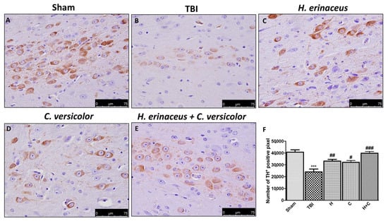 Effect of H. erinaceus or C. versicolor, or H. erinaceus + C. versicolor treatment on TH expression after chronic TBI. Immunohistochemical analysis on midbrain region showed a significant loss of TH-positive cells (B) compared to Sham mice (A). Animals treated with H, C and especially with H + C revealed an increase in the expression of TH (C–E). Data is expressed as % TH-positive pixels and are the SEM means of n = 5 mice/group. (F) *** p < 0.001 vs. Sham; ## p < 0.01 vs. TBI; # p < 0.05 vs. TBI; ### p < 0.001 vs. TBI.