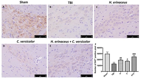 Effect of H. erinaceus or C. versicolor, or H. erinaceus + C. versicolor treatment on DAT expression after chronic TBI. Immunohistochemical analysis on midbrain region showed a significant loss of DAT-positive cells (B) compared to Sham mice (A). Animals treated with H, C and especially with H + C revealed an increase in the expression of DAT (C–E). Data is expressed as % DAT-positive pixels and are the SEM means of n = 5 mice/group. (F) *** p < 0.001 vs. Sham; ## p < 0.01 vs. TBI; # p < 0.05 vs. TBI; ### p < 0.001 vs. TBI.