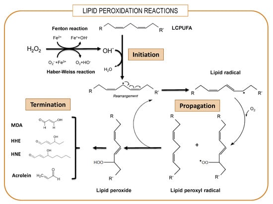 One paramount feature of brain physiology is its very high metabolic rate and elevated oxygen consumption, which inevitably produces amounts of reactive oxygen and nitrogen species (ROS and RNS, respectively) as by-products [65]. This includes the highly reactive superoxide anion O2− that is converted to H2O2 by the ubiquitous enzyme superoxide dismutase. In addition, the brain is especially rich in redox transition metals, particularly iron and copper. In the presence of iron, Fe(II) reacts with endogenous H2O2 to produce Fe(III) as well as the highly reactive hydroxyl radical OH• or peroxynitrite (ONOO-) by virtue of the Fenton reaction at the expense of endogenous reducing agents. These highly oxidant radicals easily react with polyunsaturated lipids, forming lipid radicals (L•), which in the presence of O2 form lipid peroxyl radicals (LOO•) and lipid peroxide (LOOH). This phase is self-propagating and self-sustaining because as LOO• reacts with other PUFAs, it generates additional L•, which, in turn, forms surplus LOO• and LOOH in a true chain reaction [66] (Figure 1). Lipid peroxidation is a particularly detrimental cycle, as reaction products can also act as triggers for the generation of additional lipid peroxides in the membrane via lipoxygenases, which catalyze the oxygenation of polyunsaturated fatty acyl groups to hydroperoxides [67]. Finally, as a result of electron rearrangements in the degradation phase, products of lipid peroxidation undergo fragmentation and yield different reactive intermediates called reactive carbonyl species (RCS) such as malondialdehyde (MDA), unsaturated aldehydes such as 4-hydroxy-2-trans-nonenal (HNE) and 4-hydroxy-2-trans-hexenal (HHE) and 2-propenal (acrolein) [68]. These RCS react with histidine, lysine and cysteine residues in proteins through Michael addition, converting stable adducts with carbonyl functionalities into proteins and altering structural, catalytic and transport proteins [65]. Obviously, as most polyunsaturated lipids in the brain are integrated into phospholipids, their peroxidation causes structural damage of membranes, thereby severely affecting domain viscosity, passive permeability and lipid–protein and protein–protein interactions, which impact neurotransmission, signal transduction, ion transport and electrical conduction [66,67,68,69,70,71].