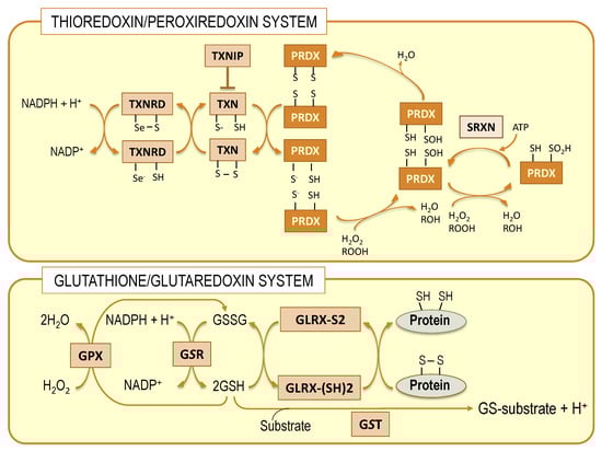 Schematic representation of thioredoxin/peroxiredoxin and glutathione/glutaredoxin systems. Both systems are interconnected at different levels. TXN: thioredoxin; TXNRD: thioredoxin reductase; TXNIP: thioredoxin interacting protein; PRDX: peroxiredoxin; SRXN: sulfiredoxin; GPX: glutathione peroxidase; GSR: glutathione S transferase; GLRX: glutaredoxin.