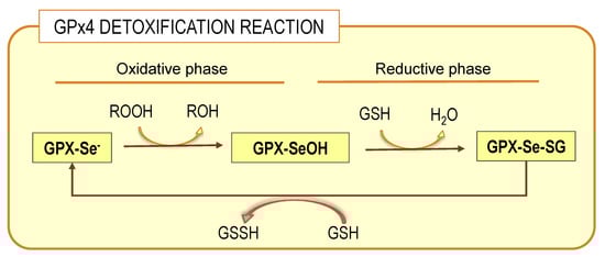 Glutathione peroxidases (GPxs) are a family of selenoproteins (selenoP) ubiquitously expressed along animal phylogeny. Eight different GPx isoenzymes have been described GPx1-8, each with unique characteristics that determine their precise biological role [80]. All GPxs bear selenocysteine, an active amino acid, as their catalytic domain, which provides them with a more efficient reaction with peroxide substrates [80]. Phospholipid hydroperoxide glutathione peroxidase, glutathione peroxidase 4 or GPx4, is the most widely expressed isoform in brain tissue, existing as a momomeric membrane-anchored glycoprotein [80]. It is unique between glutathione peroxidases in that is capable of reducing complex lipid peroxides, such as phospholipid hydroperoxides, even when integrated in highly structured lipid–protein assemblies such as lipoproteins and membranes, without prior action of membrane phospholipase A2 [79,81,82]. GPx4 preferentially uses glutathione as an electron donor as long as cellular concentrations of the reduced form (GSH) but may accept other thiol groups in proteins as a reduced equivalent. Therefore, GPx4 can either act as a GSH peroxidase or a thiol peroxidase depending on the availability of GSH [83]. Mammalian cells, including nerve cells, include three different GPx4 isoenzymes, namely cytoplasmic, nuclear and mitochondrial isoforms, which differ in their N-terminal sequences [12,31]. The detoxification reaction carried out by GPx4 encompasses two independent events: a first oxidation of the reduced enzyme by hydroperoxide (ROOH) and a second reduction of the oxidized enzyme by GSH (Figure 3).