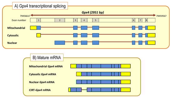 Gpx4 gene structure and transcriptional processing (A) to generate mature and CIRT mRNAs (B). Boxes indicate coding exons (blue) and UTRs (yellow). Bold brown lines represent intronic sequences. Cytoplasmic intron-sequence-retaining transcripts (CIRTs) derived from Gpx4 gene.