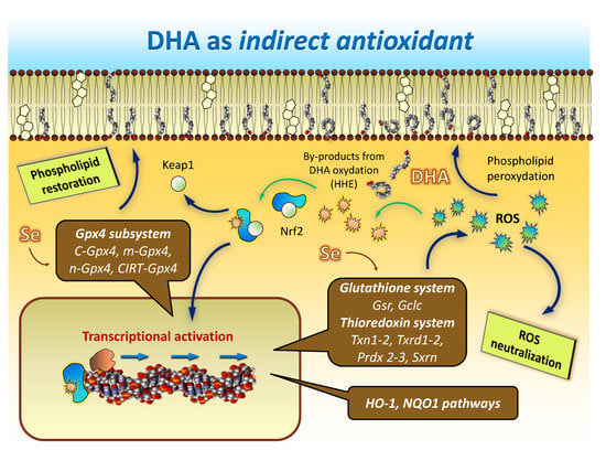 DHA is a pleiotropic molecule that modulates the physicochemical properties and architecture of neuronal plasma membrane, but beyond structural functions, DHA is also involved in multiple facets of neuronal biology, from regulation of synaptic function to neuroprotection and modulation of gene expression. In the pro-oxidant environment of brain parenchyma, DHA is highly susceptible to oxidation, but the brain neurochemistry has evolved to provide exceptional protection against LCPUFA peroxidation. The recent findings have disclosed the ability of DHA to behave as an indirect antioxidant. As such, DHA regulates a full transcriptional program that potentiates the antioxidant defenses of nerve cells, including the glutathione/glutaredoxin and thioredoxin/peroxiredoxin systems as well as Heme oxygenase 1 and NAD(P)H:quinone oxidoreductase pathways. Of these, the most elaborated is perhaps the upregulation of Gpx4, the gene encoding for the phospholipid-hydroperoxide glutathione peroxidase, also named glutathione peroxidase 4, the main enzyme capable of reducing oxidized phospholipids in-membrane. Noticeably, DHA also upregulates a cytoplasmic intron-sequence-retaining transcript from the Gpx4 gene, which behaves as a “sentinel RNA”. This expands the antioxidant protection of neuronal membrane by GPx4 away from conventional splicing in the nucleus, as in the case of dendrites. Efficient and rapid synthesis of GPx4 isozymes in the brain strongly depends on the in situ availability of selenium, the transport of which into the brain is the rate-limiting factor for selenocysteine insertion into the catalytic domain of GPx4.