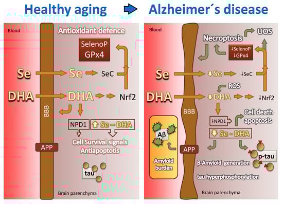 Graphical hypotheses on how changes in brain DHA and Se participate in healthy aging and in AD neurodegeneration. In AD a series of events reduces brain availability of DHA and Se. At least in part, this is due to impaired transport through the BBB and accumulation of reactive species. The reduced bioavailability of these factors triggers a cascade of cellular events, eventually leading to neuronal death, necroptosis, tau toxic amyloid β generation, amyloid burden and tau protein hyperphosphorylation. For details refer to Section 9, Section 10 and Section 11. BBB: blood–brain barrier; UOS: uncontrolled oxidative stress; APP: amyloid precursor protein. Green arrows denote deleterious events.