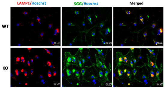 Immunofluorescence studies revealed that ARSA, saposin B, and the majority of SGG were co-localized with LAMP1 (a lysosome marker), in primary cultures of Sertoli cells from 8-month-old WT mice (Figure 1 and Figure 2), indicating that these macromolecules were present in the lysosome. This was expected, since the enzyme ARSA and its co-enzyme, saposin B, have been known as lysosomal components with SGG as their substrate [1,27]. However, anti-saposin B-reacting signals were also observed in the cytoplasm and may have reflected the precursor form of saposin B, i.e., prosaposin, which is known for its presence in the Sertoli cell cytoplasm [28]. On the other hand, a small population of SGG in the cytoplasm with a granular pattern was noted (Figure 2), suggesting its presence in membranated organelles such as endosomes. It was possible that this SGG population was the newly phagocytosed lipid, which had not yet been transported to lysosomes.