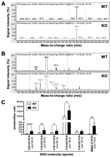 ESI-MS/MS revealed that SGG was the prevalent sulfolipid present in Sertoli cells of both 8-month-old WT and Arsa null mice, with the SGG (C16:0/C16:0, m/z 795.5) being the major molecular species (Figure 3A). However, low amounts of other SGG molecular species, including the SGG (C16:0/C14:0, m/z 768.0/767.5), (C18:1/C16:0, m/z 822.0/821.5) and (C18:0/C16:0, m/z 823.5) species were also present in WT and Arsa−/− Sertoli cells. On the other hand, an additional SGG molecular species (C20:4/C16:0, m/z 843.5) and an analogue of SGG, sulfatide SGC (C16:0, m/z 778.5) were selectively present in Arsa−/− Sertoli cells (Figure 3B,C). Quantitative analyses by MRM indicated that the amount of SGG (C16:0/C16:0) in Arsa−/− Sertoli cells was twice that of the WT counterpart (4.40 ± 1.76 versus 1.79 ± 0.73 nmole/106 cells with p < 0.05). The levels of the SGG molecular species (m/z 843.5, 821.5 and 823.5) and SGC (m/z 778.5) were also significantly higher in Arsa−/− Sertoli cells (Figure 3C).