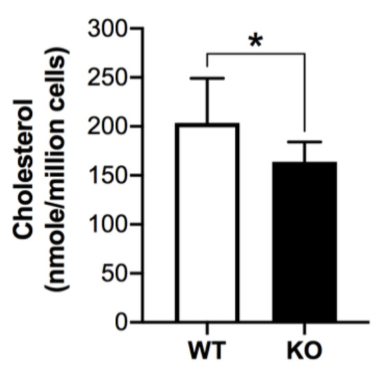 The levels of total cholesterol (free + cholesteryl esters), as analyzed by Amplex Red assay with the inclusion of cholesterol esterase in the reaction mixture, were significantly decreased in Arsa−/− Sertoli cells, as compared with those in WT Sertoli cells (i.e., 164.21 ± 20.20 versus 204.01 ± 45.45 nmole/106 cells, p < 0.05) (Figure 4).