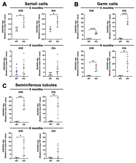 Following incubation with DHE, the levels of 2HE, representing superoxide anion, in Sertoli cells from Arsa−/− mice were increased as compared with the corresponding levels in Sertoli cells from age-matched WT mice. However, the increase was only significant statistically in Sertoli cells isolated from 5-month-old mice (Figure 5A). A similar result was observed with the levels of Eth (representing other ROS and other oxidants inside the cells) (Figure 5A). Testicular germ cells incubated with DHE also showed increases in both 2HE and Eth in Arsa−/− mice of both ages, and all increased levels in the Arsa−/− samples, as compared with the WT samples, were significant (Figure 5B). Since seminiferous tubules comprise TGCs and Sertoli cells, they were subjected to the same analyses. Increased levels of 2HE and Eth were likewise observed in Arsa−/− samples, with statistical significance for both 2HE and Eth in seminiferous tubules from 5-month-old Arsa−/− and WT animals. For seminiferous tubules isolated from animals 8 months of age, only the increase in 2HE (superoxide) levels in Arsa−/− seminiferous tubules was significant (Figure 5C).