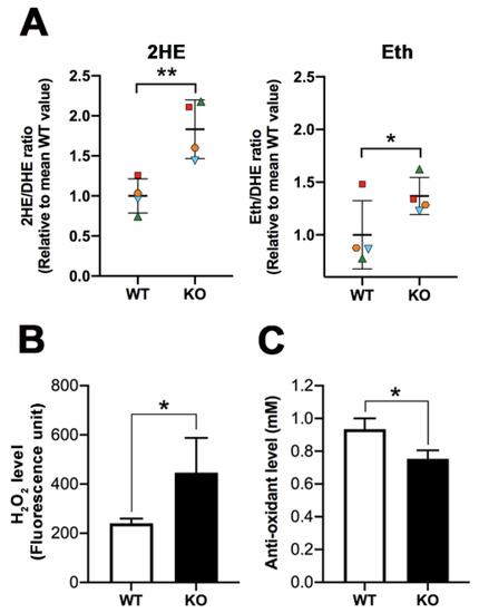 (A). Higher superoxide anion levels (2HE) and other ROS plus oxidants (Eth) in the cauda epididymis of 8-month-old Arsa null mice, compared with age-matched WT mice. Data from the KO mice were expressed as fold increases over the corresponding values from WT mice in a similar manner as described in the Figure 5 legend. Results were from four replicate experiments. Higher amounts of H2O2 (B) but lower levels of antioxidants (C) in the caudal epididymal fluid of 8-month-old Arsa KO mice, compared with the counterpart fluid of age-matched WT mice were also displayed. Results on both quantifications were from three replicate experiments. *, ** denotes p < 0.05 and 0.001, respectively.