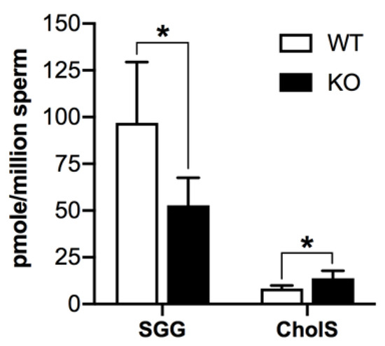 Changes of sulfolipid levels in sperm from 8-month-old Arsa KO mice, as compared with sperm from age-matched WT mice. Two main sperm sulfolipids, SGG and cholesterol sulfate (CholS) were quantified by ESI-MS/MS-MRM. Results were from three replicate analyses. In each analysis, 3 and 10 WT and Arsa KO mice were used to prepare Percoll-gradient-centrifuged sperm, respectively, from which lipids were extracted for lipidomics work. * denotes p < 0.05.