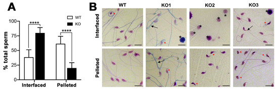 Changes of sperm morphology from the WT characteristics appeared to correlate with aberrant levels of sperm sulfolipids in Arsa−/− mice. In normal fertile animals, the subjection of caudal epididymal sperm to Percoll density gradient centrifugation results in the separation of sperm into two populations, i.e., pelleted sperm in the bottom of the tube and sperm interfaced between the two Percoll gradient solutions (35/70% gradient or 45/90% gradient). The pelleted sperm population, constituting about 65% of total sperm, has a high fertilizing ability due to normal sperm morphology, and great motility upon resuspension in medium. On the other hand, the interfaced sperm population (the remaining 35%) is mainly immotile with minimal fertilizing ability. Electron microscopic analyses also reveal the abnormal ultrastructure of interfaced sperm, for example, membranated vesicles surrounding the sperm head and midpiece, and incomplete chromatin condensation [20]. The distribution of the pelleted and interfaced sperm populations of 8-month-old WT mice was as expected for normal fertile animals, i.e., 65% and 35%, respectively (Figure 11A). Although the morphology of almost all of the WT interfaced and pelleted sperm was not distinguishable from each other by light microscopy (Figure 11B), the motility of the two sperm populations was drastically different. More than 90% of WT pelleted sperm were motile, whereas the majority of WT interfaced sperm were immotile (data not shown).
