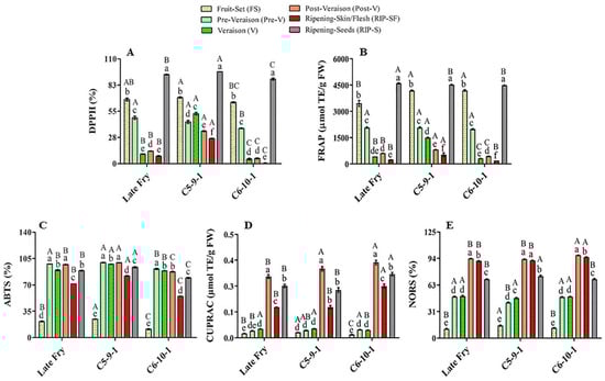 Antioxidant activities of muscadine grape genotypes at different developmental stages were determined using DPPH (A), FRAP (B), ABTS (C), CUPRAC (D), and NORS (E) assays. The experiments were carried out in three biological replicates, and each replicate was repeated three times (n = 9). Data represent the mean values ± SD (n = 3). The different lowercase letters represent the significant differences among developmental stages of an individual genotype, and the different uppercase letters refer to the significant differences between genotypes of a particular developmental stage, according to Duncan’s multiple-range test (p > 0.05).