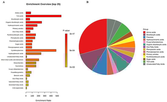 (A) Bar chart and (B) interactive pie chart of the chemical classification of muscadine metabolites at selected developmental stages using metabolite set enrichment analysis (MSEA). Colors in the bar plot describe the p-value. The red and orange colors signify the high and low values, respectively. The lines indicate the enrichment ratio, which was computed by hits/expected, where hits = observed hits and expected = expected hits. The colors in the interactive pie chart designate each chemical group relative to the total number of compounds.