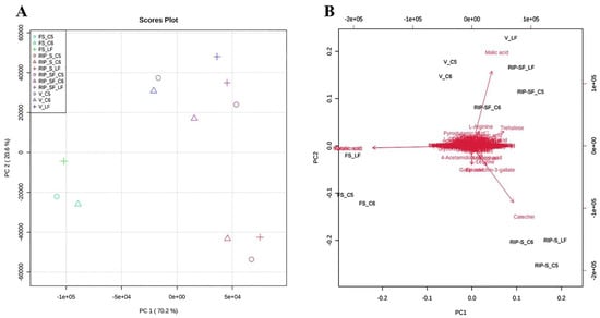 Principal components analysis (PCA) 2D score plot (A) and biplot (B) of the muscadine metabolites at selected developmental stages. The different short abbreviations in the biplot manifest the scores of the observations (i.e., muscadine genotypes). The vectors that point toward the same direction correspond to the variables (i.e., metabolites) with similar response profiles. The green color of the oval, triangle, and cross shape represents FS_C5, FS_C6, and FS_LF; blue represents V_C5, V_C6, and V_LF; purple represents RIP-SF_C5, RIP-SF_C6, and RIP-SF_LF; and red represents RIP-S_C5, RIP-S_C6, and RIP-S_LF. FS_LF: fruit-set_Late Fry; FS_C5: fruit-set_C5-9-1; FS_C6: fruit-set_C6-10-1; V_LF: veraison_Late Fry; V_C5: veraison_C5-9-1; V_C6: veraison_C6-10-1; RIP-SF_LF: ripening-skin/flesh_Late Fry; RIP-SF_C5: ripening-skin/flesh_C5-9-1; RIP-SF_C6: ripening-skin/flesh_C6-10-1; RIP-S_LF: ripening-seeds_Late Fry; RIP-S_C5: ripening-seeds_C5-9-1; RIP-S_C6: ripening-seeds_C6-10-1.