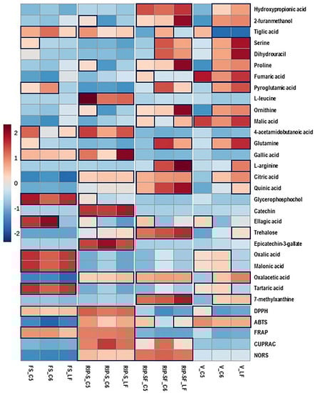 Heatmap analysis of candidate metabolites (VIP > 0.5) obtained by partial least-squares–discriminant analysis (PLS-DA) and antioxidant activities of muscadine genotypes at selected developmental stages. Each column refers to the muscadine genotype at different developmental stages, and each row indicates the metabolites and antioxidant activities. The red and blue colors in the plot describe high and low intensities, and the values range from –2 to +2. The higher the red color intensity (from +1 to +2 values), the higher the metabolite contents and antioxidant activities; in contrast, the higher blue color intensity (from –1 to –2 values) represents lower metabolite contents and antioxidant activities. FS_LF: fruit-set_Late Fry; FS_C5: fruit-set_C5-9-1; FS_C6: fruit-set_C6-10-1; V_LF: veraison_Late Fry; V_C5: veraison_C5-9-1; V_C6: veraison_C6-10-1; RIP-SF_LF: ripening-skin/flesh_Late Fry; RIP-SF_C5: ripening-skin/flesh_C5-9-1; RIP-SF_C6: ripening-skin/flesh_C6-10-1; RIP-S_LF: ripening-seeds_Late Fry; RIP-S_C5: ripening-seeds_C5-9-1; RIP-S_C6: ripening-seeds_C6-10-1.
