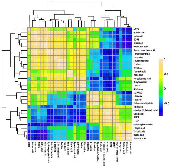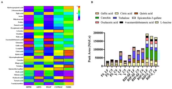 Additionally, a heatmap Pearson’s correlation analysis was performed to determine the correlation between candidate compounds and antioxidant activities (Figure 6). The yellow, green, and blue colors in the plot represent the higher-to-lower correlation intensity. According to the Pearson correlation coefficient, cluster analysis suggested that DPPH and FRAP antioxidant activities had a similar pattern compared to other types of antioxidant activities. This evaluation also complies with our antioxidant results, as presented in Figure 2. A detailed view of Pearson’s correlation coefficient among candidate compounds with individual antioxidant activity is separately shown in Figure 7A. It was observed that gallic acid and 4-acetamidobutanoic acid were highly correlated with DPPH and FARP antioxidant activities. In addition, epicatechin-3-gallate, catechin, and L-leucine were positively correlated with only DPPH. In comparison, oxalacetic acid and citric acid were regarded as highly associated with ABTS radical-scavenging activity. Epicatechin-3-gallate, catechin, and L-leucine also showed a higher positive correlation with CUPRAC antioxidant potential. However, oxalacetic acid, trehalose, quinic acid, and citric acid were highly correlated with NORS activity. In the meantime, 7-methylxanthine and hydroxypropionic acid showed a positive correlation with NORS. Among these nutritional biomarkers, nine compounds were positively associated with different antioxidant activities: gallic acid, citric acid, quinic acid, catechin, trehalose, epicatechin-3-gallate, oxalacetic acid, 4-acetamidobutanoic acid, and L-leucine.