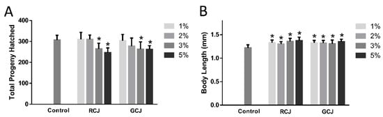 3.6. RCJ and GCJ Decreased Brood Size and Increased Body Length