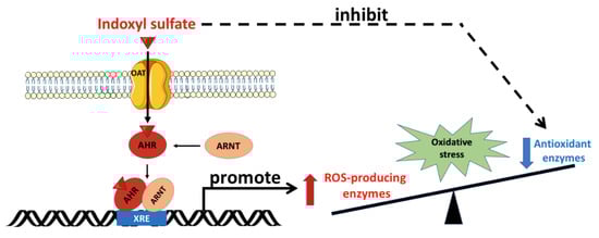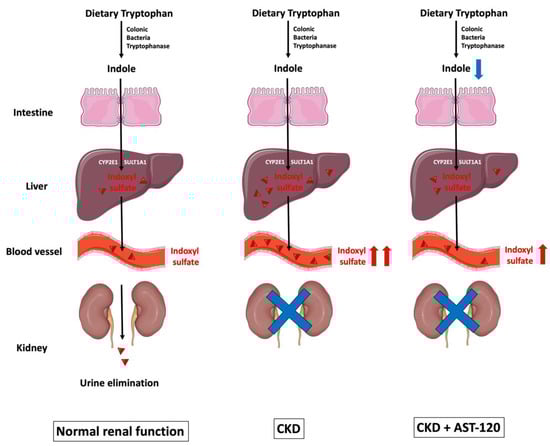 The presence of oxidative stress is a result of the imbalance between the increase in reactive oxygen/nitrogen species (ROS/RNS) and the decrease in antioxidant capacities (redox imbalance). Oxidative stress has a devastating effect on cellular carbohydrates, lipids, proteins, and nucleic acids, which hinders normal physiological functions. Oxidative stress is a well-known causative factor in developing atherosclerotic lesion formation, which contributes to cardiovascular (CV) disease [1,2]. In chronic kidney disease (CKD), such oxidative-stress-related redox imbalance is linked to the pathological complications caused by the accumulation of uremic toxins, such as CV disease, renal function decline, uremic bone disease, muscle wasting, and renal anemia [3,4,5,6,7,8]. Uremic toxins are compounds that are usually excreted by the kidneys, and accumulate in the blood during the progression of CKD. Uremic toxins can be classified by a useful and widely accepted categorization based on plasma-protein-binding characteristics and molecular weight: low (<500 daltons), middle, and high (>12,000 daltons) [9]. Low-molecular-weight, water-soluble compounds lack protein-binding capacity, and are quite easily removed by conventional hemodialysis. Low-molecular-weight, water-soluble compounds include urea, creatinine, phosphate, guanidine, and asymmetric dimethylarginine. Urea and creatinine do not exert much toxicity on physiological functions, and are commonly used as markers for assessing renal function and dialysis clearance [10]. Conversely, protein-bound uremic toxins are hard to remove via dialysis due to their protein-binding capacity, even though their molecular weight is less than 500 daltons. Most of these protein-bound uremic toxins are generated by intestinal bacteria fermentation, and include phenolic compounds originated from tyrosine and phenylalanine, as well as indolic compounds originated from tryptophan, such as indoxyl sulfate (IS) [11]. Both of these compounds might be involved in the pathogenesis of accelerated CV disease and mortality in CKD [12,13,14]. The involvement of uremic toxins in redox imbalance has recently provoked a growing interest in CKD. In fact, CKD patients typically suffer from redox imbalance associated with uremic toxins, which often worsens CKD complications progressively with the degree of renal failure. Accumulating evidence has shown that IS exhibits pro-oxidant effects on various exposed tissues in CKD [15,16]. Thus, investigating IS’s pro-oxidant role is of primary importance in CKD-associated complications. This article summarizes the mechanisms by which IS exerts pro-oxidant influence in CKD patients, and how AST-120, an oral charcoal adsorbent, facilitates IS accumulation and ameliorates IS-mediated organ damage in CKD.