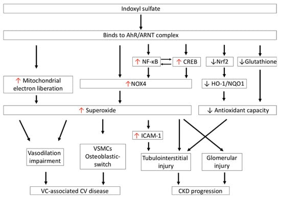 Increased IS accumulation contributes a significant CV risk in patients with CKD and end-stage renal disease (ESRD), as summarized in Figure 3 [73]. IS significantly increases superoxide generation in endothelial cells, and attenuates vasorelaxation induced by sodium nitroprusside through the effect of the AhR and the activation of NOX [74]. The impairment of vasorelaxation after IS treatment can be reversed by a given superoxide scavenger or organic anion transporter inhibitor in tissue preparations of rat abdominal aortae [75]. Therefore, IS is considered to be a vascular toxin. Serum IS levels present a positive correlation with aortic calcification and vascular stiffness, and are a useful tool to predict overall and CV death in CKD patients [76]. Furthermore, IS also increases superoxide generation in vascular smooth muscular cells (VSMCs) in a time- and concentration-dependent manner. IS-mediated superoxide generation in VSMCs is predominantly derived from the upregulation of NOX4, but is not related to XO or to the mitochondrial electron transport chain pathway [77]. In addition, NOX4 is also involved in IS-promoted osteoblastic phenotype transition of VSMCs by increasing osteoblast-specific proteins, alkaline phosphatase, osteopontin, and core-binding factor-1 production [77]. These findings suggest that the accumulation of IS in serum during renal excretory deterioration increases the NOX4-mediated oxidative stress burden, and has a deleterious effect on endothelium-dependent vasodilatation and transdifferentiation of VSMCs to the osteoblastic phenotype, which is involved in the development of vascular calcification in CKD patients.