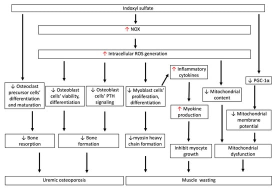 As shown in Figure 4, IS can directly inhibit cell proliferation and reduce myogenic differentiation to myosin heavy chain through the increase in NOX-mediated ROS generation in murine C2C12 myoblast cells. The increased number of intracellular ROS in myoblast cells can concurrently provoke the release of inflammatory cytokines (tumor necrosis factor-α, interleukin 6, and TGF-β1) in myoblast cells, which stimulate the production of myostatin and atrogin-1—myokines that function as inhibitors to suppress muscle cell growth, leading to muscle atrophy. The muscular oxidative-stress-mediated inflammation in myoblast cells can be abrogated by the AhR inhibitor CH-223191, the antioxidant ascorbic acid, or the OAT inhibitor probenecid. IS was administered chronically to the subtotal nephrectomy animal model, and the expression of inflammatory markers and myokines as described above in the gastrocnemius muscle was significantly downregulated; these findings are consistent with findings from an in vitro experiment [33]. Furthermore, Sato et al. analyzed femoral muscle tissue sections from adenine-induced CKD mice, and showed through mass spectrometry imaging that the dissolution area of the femoral muscle contained a higher intramuscular IS concentration [114].