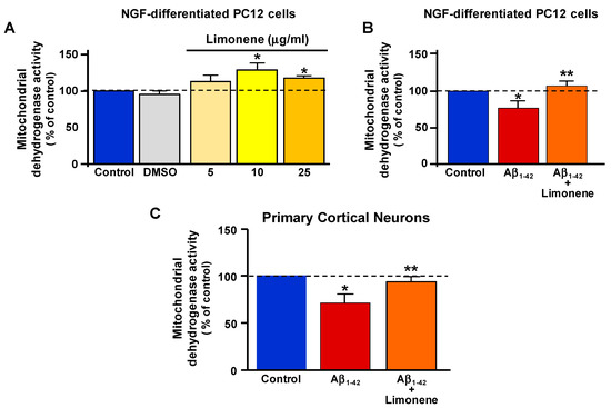 Effects of limonene on mitochondrial dehydrogenase activity in NGF-differentiated PC12 cells and primary cortical neurons exposed to Aβ1-42 oligomers. (A) Evaluation of the mitochondrial dehydrogenase activity by MTT assay in NGF-differentiated PC12 cells exposed to limonene at different concentrations (5, 10, and 25 µg/mL) for 24 h. (B,C) Quantification of mitochondrial dehydrogenase activity assessed by MTT assay in NGF-differentiated PC12 cells (B) and primary cortical neurons (C) exposed to Aβ1-42 oligomers (5 µM/24 h) in the presence and in absence of limonene (10 µg/mL, 30 min pre-treatment). Data are shown as percentage of mitochondrial dehydrogenase activity (compared to control cells) and values are expressed as mean ± SEM of three independent experimental sessions (* p < 0.05 vs control; ** p < 0.05 vs. Aβ1-42).