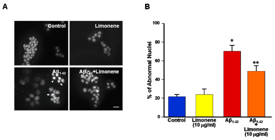 Effects of limonene on nuclear morphology in primary cortical neurons exposed to Aβ1-42 oligomers. (A) Representative images of Hoechst-33258 nuclear morphological abnormalities in primary cortical neurons under control conditions, in neurons treated with limonene (10 µg/mL/24 h), and treated with Aβ1-42 oligomers (5 µM/24 h; see white arrows) in the absence and in presence of limonene (10 µg/mL, 30 min pre-treatment) Scale bar: 20 μm. (B) Quantification of nuclear morphology with Hoechst-33258 in A. Data are shown as percentage of abnormal nuclei (relative to total nuclei) and values are expressed as mean ± SEM of four independent experimental sessions in which at least 10 microscopic fields were analyzed (* p < 0.05 vs. control; ** p < 0.05 vs. Aβ1-42).
