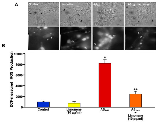 Effects of limonene on ROS production in primary rat cortical neurons exposed to Aβ1-42 oligomers. (A) Representative phase-contrast (top) and corresponding DCF fluorescence images (bottom) of primary cortical neurons under control conditions, in neurons treated with limonene (10 µg/mL/24 h), or treated with Aβ1-42 oligomers (5 µM/24 h) in the absence and in presence of limonene (10 µg/mL, 30 min pre-treatment). Black and white arrows indicate differences occurring at the level of prolongations and fluorescence intensity, respectively. Scale bar: 20 μm. (B) Quantification of intracellular ROS production in A. Data are depicted as DCF fluorescence values (arbitrary units) expressed as mean ± SEM of three independent experimental sessions. * p < 0.05 vs controls; ** p < 0.05 vs Aβ1-42.