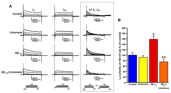 Previously, we provided evidence that Aβ1-42 oligomers induced a selective up-regulation of KV3.4 channels through the ROS-dependent activation of the transcription factor NF-kB [36] and that the subsequent increase of K+ efflux was involved in neuronal and astrocytic damage [32,36,40]. Since the blockade of KV3.4 appeared to be an effective strategy to counteract Aβ1-42-mediated caspase-3 overactivation [38,39], we here tested the hypothesis that limonene could prevent the ROS-dependent up-regulation of fast-inactivating IA currents mediated by KV3.4 in primary cortical neurons exposed to Aβ1-42 oligomers. First, we performed patch-clamp experiments in primary cortical neurons treated with Aβ1-42 oligomers (5 µM/24 h) to assess fast-inactivating IA current amplitude carried by KV3.4 channels. In line with our previous reports, patch-clamp experiments revealed that Aβ1-42 oligomers were able to markedly enhance IA density. On the other hand, we found that pre-treatment with 10 µg/mL limonene largely prevented the increase of fast-inactivating IA currents induced by Aβ1-42 oligomers (Figure 4).