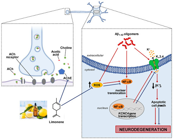 Considering that ROS-mediated KV3.4 overexpression may intervene in both neurodegeneration and neuroinflammation underlying AD development [29,32,35,36,37,38,39,40], limonene may assume a novel neuroprotective meaning. Therefore, limonene, controlling the modulation of KV3.4 channels in AD brain via ROS production, might represent a novel therapeutic approach for slowing down the progression of the disease. Therefore, after an accurate examination of the molecular pathway involved in its mechanism, the modification of limonene to serve as prominent scaffold in designing novel bioactive compounds should be taken into consideration as a new potential avenue in AD intervention.