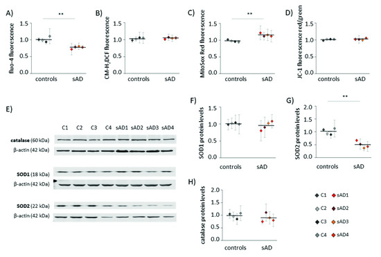An increasing number of reports have shown that mitochondrial dysfunction is an early event in AD development [10,18,19] and that this dysfunction is not limited to neurons, but may also be observed in the peripheral tissues of AD patients [20,21,22,23,24]. Alterations in mitochondrial homeostasis affect multiple aspects of cellular function, including calcium handling, redox homeostasis and metabolism. In the investigated control and sAD fibroblasts, we analyzed the cytosolic levels of Ca2+ and ROS (Figure 1A,B). Both of these parameters are reciprocally related to mitochondrial function, as they are affected by changes in mitochondrial activity, and are, at the same time, carriers of information on the mitochondrial functional state in mitochondria-to-nucleus communication (mitochondrial retrograde signaling) [25]. In the investigated sAD fibroblast lines, the cytosolic Ca2+ was 23 ± 3.8% lower than that in the controls, while the cytosolic ROS appeared unaltered. We also analyzed the following parameters that are directly related to mitochondrial function: mitochondrial membrane potential (ΔΨ) and mitochondrial superoxide levels (Figure 1C,D), which both tightly reflect the mitochondrial functional state. The ΔΨ was comparable in all of the investigated cell lines, but we detected a slight increase in mitochondrial superoxide in the sAD fibroblasts (on average 18 ± 4.8% higher than in the controls). It was accompanied by clearly lower levels of SOD2 (50 ± 13.0% decrease), which is responsible for the superoxide removal from the mitochondrial matrix. There were no changes in the levels of catalase or SOD1, which is present in the cytosol and in the mitochondrial intermembrane space (Figure 1E–H).
