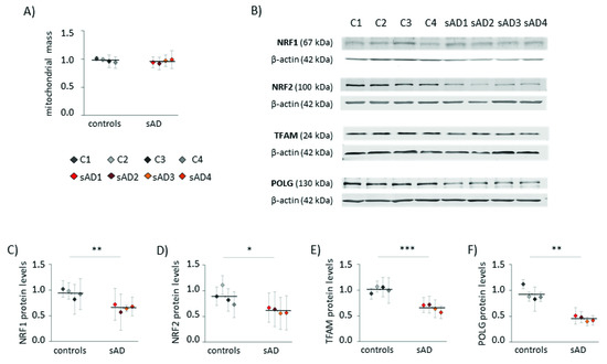 Increased levels of mitochondrial superoxide may result not only from changes in mitochondrial function, but also from elevated mitochondrial content in the cell. Increased mitochondrial biogenesis is often a response to bioenergetic stress, aiming to compensate for the decreased efficiency of ATP production [26]. However, in the analyzed fibroblasts, the mitochondrial mass did not differ between sAD and the controls (Figure 2A). Moreover, in the sAD cells, we observed lower levels of the following proteins involved in mitochondrial biogenesis: mitochondrial DNA polymerase POLG and mitochondrial transcription factor TFAM, activating the transcription of mitochondria-encoded genes (lower than in the controls by 51 ± 5.5% and 35 ± 6.9%, respectively—Figure 2E,F). Additionally, nuclear transcription factors NRF1 and NRF2, coordinating mitochondrial biogenesis, were slightly decreased in the sAD cells compared to the controls (by 30 ± 6.8% and 31 ± 6.0%, respectively—Figure 2C,D).