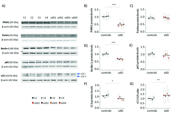 The amount of mitochondria in the cell is the result of opposing processes of mitochondrial biogenesis and mitophagy [25]. Thus, we also checked the levels of proteins involved in the process of autophagy, as well as those specific for mitophagy—the selective autophagy of mitochondria (Figure 3). Many of them turned out to be decreased in sAD fibroblasts when compared to the control cell lines; the levels of PINK1 were lowered by 51 ± 7.7%, of Beclin-1 by 31 ± 4.3%, and of LC3 by 23 ± 11%. These proteins act at different stages of mitochondrial removal by mitophagy, as follows: PINK1 mediates the labeling of dysfunctional mitochondria directed for removal, while Beclin-1 and LC3 coordinate autophagosome formation [26,27].