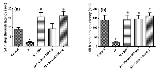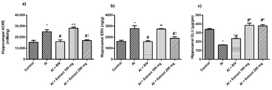 From another perspective, aluminum can induce oxidative stress in the neurons, as it is an intoxicating pro-oxidant well known to augment lipid peroxides in the hippocampus [28]. This was notable in our study, as indicated by the significantly increased level of MDA in the AlCl3-treated rats. The administration of the extract significantly restored normal MDA levels. This positive outcome of the extract on oxidative stress is possibly due to its high content of antioxidant phenolics and flavonoids [12]. Polyphenols can protect rats from aluminum-induced brain neuroinflammation and cognitive impairments. Similar studies with polyphenol-rich extracts from pomegranate peel showed a reduced aluminum accumulation and stimulation of anti-apoptotic proteins in the rats’ brains [29,30].