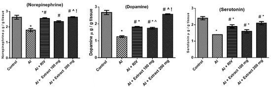Reduced levels of neurotransmitters belonging to the biogenic amine family in the brain is connected with a decline in memory in aging people [35]. In our study, AlCl3 significantly reduced noradrenaline, dopamine and serotonin levels in rat brains, in agreement with Kinawy et al. [36] and Foster et al. [37]. The treatment of rats with the extract significantly increased all monoamine levels. This is attributed to the presence of terpenoids, flavonoids and polyphenols, which have anti-inflammatory and antioxidant properties [38,39]. In summary, plant drugs rich with antioxidants have neuroprotective and anti-neurodegenerative roles by protecting against neuronal cell damage [40]. They offer a favorable potential in the control and management of numerous neurodegenerative conditions such as Morbus Alzheimer, Parkinson’s and Huntington disease [41,42,43].
