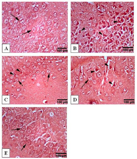 Photomicrographs of Congo red-stained hippocampus tissue (400×). (A) Normal group exhibiting normal histology structure of hippocampus with normal neuronal cells (arrow), (B) AlCl3-treated group exhibiting marked multifocal Aβ deposition in hippocampus (arrow head), (C) AlCl3/rivastigmine-treated group showing normal appearance of hippocampus with intact neuronal cells (arrow) combined with mild multifocal Aβ deposition (arrow head), (D) AlCl3/low dose of the extract-treated group showing normal histological appearance of hippocampus with intact neuronal cells (arrow) as well as mild to moderate multifocal Aβ deposition (arrow head), (E) AlCl3/high dose of the extract-treated group showing normal histological appearance of hippocampus with intact neuronal cells (arrow).