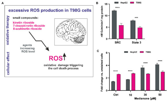 Aerobic status of glioblastoma (T98G) and non-glioblastoma (HepG2) cells. (A) Involvement of small compounds in the oxidative therapy of T98G cells. (B) Comparison of spare respiration capacity (SRC) and phosphorylating state (state 3) of T98G cells (gray) vs. HepG2 cells (magenta) by using the Oxygraph+ system. (C) Flow cytometry analysis of comparative mitochondrial oxidative stress induction in T98G cells (gray) and HepG2 cells (magenta) after menadione treatment. Fluorescence intensity shift is presented as a bar graph (mean ± SD) of three independent experiments. Statistical significance is indicated with asterisks: *** p < 0.001, **** p < 0.0001.