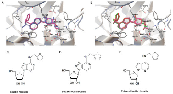 The estimated binding energy calculated by AutoDock Vina for the reference ligand dimethyladenosine from 2A9Y was −9.4 vs. −9.2 for KR. Both conformers were generally well superimposed with all the crucial protein–ligand interactions being preserved (Figure 2A). Therefore, it can be assumed that the presence of the N6-furfuryl group in KR did not impair the ability of the molecule to adopt a proper conformation and be accommodated in the binding cavity. Moreover, the docking results suggest that the N6-furfuryl group of KR can form an additional hydrophobic interaction with the side-chain of Leu138. Two compounds, namely, 8-azakinetin riboside (8-azaKR) and 7-deaza kinetin riboside (7-deaza-KR), were predicted to dock particularly well in the binding cavity of the ADK model (Figure 2B). Moreover, the extra nitrogen atom in 8-azaKR was predicted to form additional polar interactions with side-chains of Cys123 and Gln38. The estimated binding energies calculated by AutoDock Vina for both derivatives were lower than that for KR, with values of −9.6 and −9.3 for 8-azaKR and 7-deazaKR, respectively, indicating that the two KR derivatives might have similar affinity to ADK as KR alone. Interestingly, 8-azaadenosine and some adenosine analogues containing a 7-deaza ring (sangivamycin and toyocamycin) are known to be phosphorylated by ADK and further incorporated into DNA and RNA, which contributes to their anticancer properties [37,38,39]. This characteristic makes the two adenine ring modifications particularly attractive to test in the context of KR derivatives. Furthermore, it has been shown that 8-azaadenosine is rapidly deaminated inside the cells and that cytotoxicity of 8-azaadenosine is enhanced when cells are pretreated with an adenosine deaminase inhibitor [37]. The presence of the furfuryl group at N6 of 8-azaKR would most likely prevent the deamination reaction, which could contribute to increased potency of 8-azaKR inside the cells in comparison to 8-azaadenosine. Derivatives of KR were obtained according to the previously reported procedure for the synthesis [33] (Figure 2C–E).