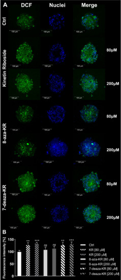 To determine and confirm whether treatment with 80 and 200 μM KR, 8-azaKR, and 7-deazaKR induces cytoplasmic ROS generation, we performed confocal microscopy analysis of the T98G cell spheroids double stained with 2′,7′-dichlorodihydrofluorescein diacetate (H2DCFDA) and Hoechst 33342 for cell nuclei (Figure 4). H2DCFDA forms a fluorescent compound after reaction with ROS. The 24 h treatment presented an increase in fluorescence derived from the oxidized dye up to approximately 30% at the highest concentrations of KR and 7-deazaKR, thus showing the induction of OS (Figure 4A,B). We observed minimal changes (not statistically significant) in the fluorescence intensity of the dye after 8-azaKR treatment, which was comparable to that for the untreated spheroids, thus indicating that 8-azaKR did not interfere with the redox status of the treated spheroids.