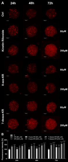 The T98G cell spheroid culture model that mimics the extracellular microenvironment of the tumor was used to obtain more precise prediction of the in vivo results of compound rating and was the first step to screen KR derivatives. The viability of cells within the spheroids was analyzed using the LIVE/DEAD® Viability/Cytotoxicity Kit by confocal microscopy (Figure 3A), and fluorescence intensity was then estimated (Figure 3B). Staining with ethidium homodimer-1 was used to indicate a loss of cell membrane integrity (red fluorescence), while calcein AM fluorescence demonstrated metabolically viable cells (green fluorescence). We investigated the distribution of living and dead cells after treatment with 80 and 200 μM KR, 8-azaKR, and 7-deazaKR; the results revealed that all three compounds affected cell viability in a time- and dose-dependent manner. After 24 h incubation, the most potent effect was visible after KR and 7-deazaKR treatment, regardless of the concentration, which was observed as an increase in red fluorescence from dead cells (Figure 3A). Moreover, inhibition of cell proliferation and rupture of the outer layer of cell spheroids were observed. The observed minimal changes (not statistically significant) in the red fluorescence intensity of the dye showed that 8-azaKR did not interfere with the viability of the treated spheroids. The percentage of dead cells (ethidium homodimer-1-stained) after KR and 7-deazaKR treatment increased with more than a twofold change in fluorescence intensity as compared to that for untreated cells for the highest doses of the compounds (Figure 3B). The cell viability analysis after 72 h revealed that KR and 7-deazaKR at 80 μM concentration showed a strong effect (Figure 3A). Moreover, after treatment with 200 μM concentration of these compounds, the structure of the spheroid was already relaxed and less compact, which might lead to spheroid breakdown and leakage of the dyes. Treatment with 200 μM 8-azaKR for 72 h caused a slight increase in the fluorescence intensity as compared to that for untreated cells which remained viable; however, cell death occurred (Figure 3A,B).
