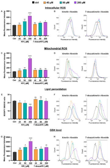 These results firmly suggest that OS elicited by KR and 7-deazaKR can be the trigger of T98G cell apoptosis (Figure 7). Furthermore, KR showed a greater effect on the mitochondrial OS induction with simultaneous activation of lipid peroxidation.